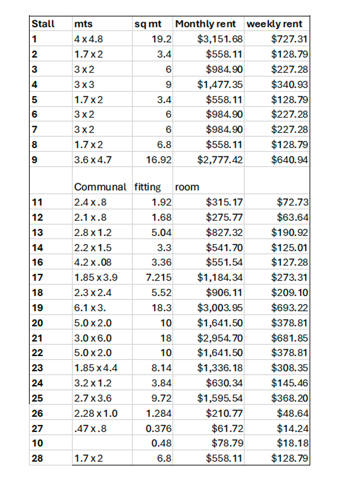 Rent, Power, Staffing, Marketing & PR including paid ads, dedicated website ( with links to your websites) and social media, Public liability insurance, Rubbish and Recycling. One off monthly payment with no hidden fees.